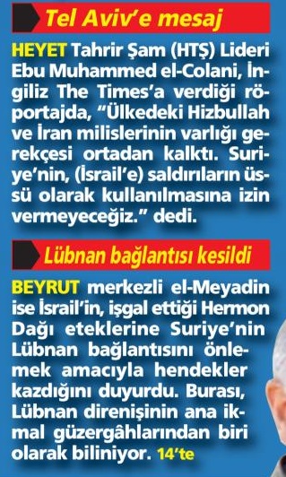 Heyet Tahrir El Şam'ın (HTŞ) lideri Ebu Muhammed el-Colani, İngiltere yayın kuruluşu The Times'a röportaj verdi. Colani, çatışma istemediklerini belirterek Suriye'nin, İsrail ya da başka bir devlete karşı saldırılar için fırlatma rampası olarak kullanılmasına izin vermeyeceklerini açıkladı.